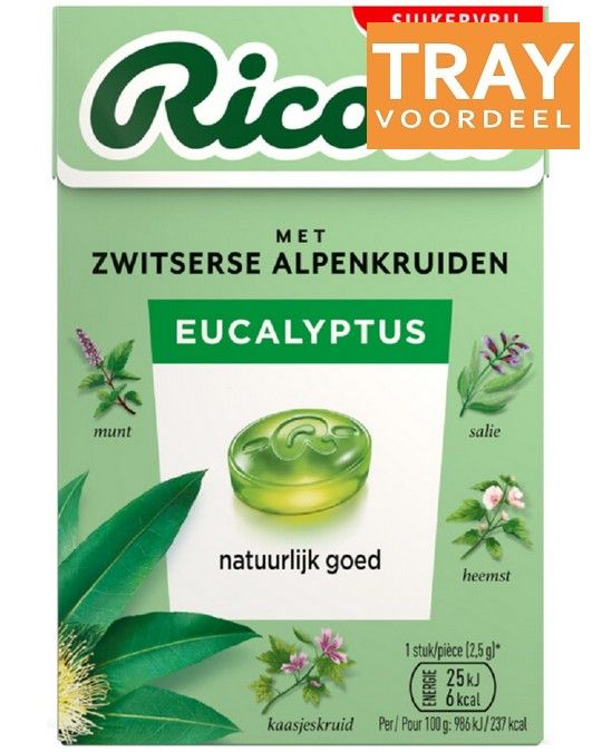 RICOLA EUCALYPTUS SUIKERVRIJ KRUIDENPASTILLES TRAY 20 X 50 GRAM