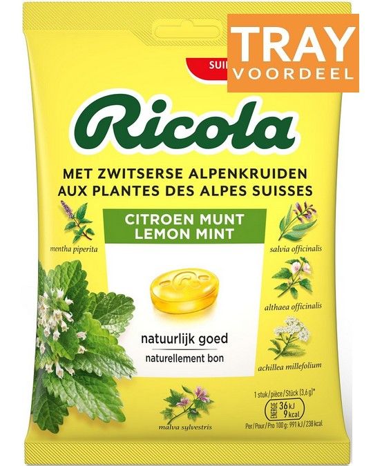 RICOLA CITROEN MUNT SUIKERVRIJ KRUIDENPASTILLES TRAY 12 X 75 GRAM