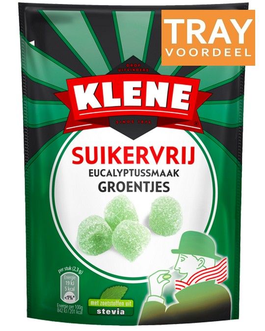 KLENE EUCALYPTUSSMAAK GROENTJES SUIKERVRIJ DROP TRAY 12 X 90 GRAM